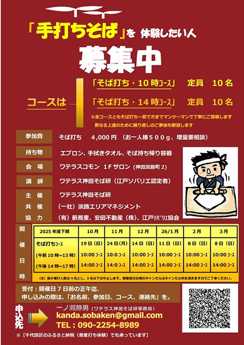 最新ニュース一覧 初心者向けそば打ち教室「そば研」参加者募集中! 投稿者 : sobashogun 投稿日時: 2025-10-03 12:23:43 そばにまつわる座学や実技を通して“江戸蕎麦の通人”を表す民間資格「江戸ソバリエ」の認定者が講師となり、初心者向けにそば打ち等の料理教室を実施している倶楽部「ワテラス神田そば研」(以下、そば研)にて、現在2025年度下半期の生徒を募集中だ。