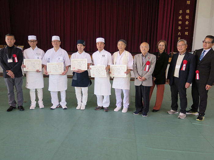 最新ニュース一覧 第12回「武蔵の国そば打ち名人戦」開催! 投稿者 : sobashogun 投稿日時: 2025-12-02 16:11:43 11月15日、第12回「武蔵の国そば打ち名人戦」(主催/そば塾彩蕎庵「全国ご当地そば伝統継承・推進協議会」)が、志学会高等学校の体育館(埼玉県・杉戸町)で開催された。武蔵の国の名人戦は、江戸時代からソバの産地として知られている武蔵の国で、そばを「うまく食す」ために卓越したそば打ち技術を身に付けた人達が腕を競い合い、「名人」を決定するものだ。大会委員長には小川喜久次氏(武蔵の国そば打ち2代名人/江戸ソバリエ)、競技審査委員長をほしひかる氏(江戸ソバリエ協会認定委員長)、競技審査委員は平松一馬氏(全日本素人そば打ち17代名人)、仲山徹氏(全日本素人そば打ち23代名人/全麺協七段位)、横田節子氏(全麺協六段位/江戸ソバリエ)が務め、食味審査は、競技審査委員4名に一般審査員2名が加わり6名で行われた。名人戦参加者は21名。予選は各自が持参したソバ粉を45分で打つ。審査は水回し、捏ね、延し、切り等の工程を見る。その結果、五名が決勝に進出し、茹で、食味が審査される。決勝は1人ずつ行うため、競技者の一挙一動に審査委員の目が注ぎ、会場は緊迫した空気につつまれた。