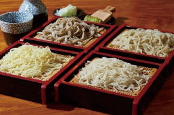 信州に伝わる故事をもとに明治時代に創始された、日本で唯一のそば打ち流儀である「信州内藤流」。その継承者である店主が打つ、田舎・変わり・細打ち・黒細打ちの4種類のそばが楽しめる「四色もり」(1,900円)等。