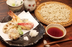 「天せいろ」(1,620円)は、エビ2尾、ししとう、レンコン、シイタケ、パプリカの天ぷらの盛り合わせ。そばは九一で打った端整な細切りのそばで、ふんわりと香りが立ち、ほどよい甘みのモッチリとした食感が楽しめる。