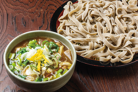 「けんちんそば」(600円)は栃木県や茨城県の郷土料理「けんちん汁」をもとにした同店の看板メニュー。 ゴボウや人参、大根や里芋がこれでもかと入れられたけんちん汁に、これまた大量のそばが入ったボリューミーな逸品。そばはほうとうのような太打ちで、噛みごたえとコシに優れる。