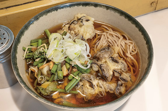 駅そば発祥の地という文言の書籍コピーが飾られている「おぎのや軽井沢駅売店」。「山菜舞茸天そば」(800円)は、山菜が載るかけそばに舞茸天をトッピングしたもの。麺をうどんに変更することもできる。