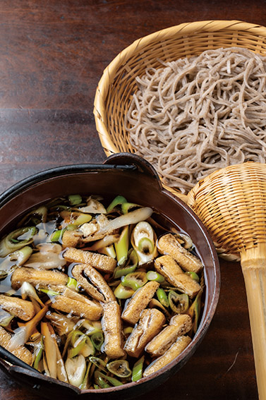 「とうじそば」(3,600円/2人前から)。長野県松本市奈川地区の郷土料理であるとうじそば、つゆと山菜、鶏肉、キノコ等を煮込んだ鍋にとうじ籠に入れたそばをくぐらせて食べる。そばは十割の手打ち、ソバは大町・白馬産の信濃一号を使っている。