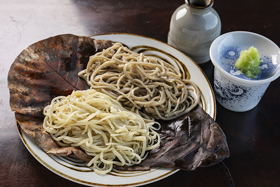 2024年に農林水産省の「料理マスターズ」ゴールド賞を受賞した館主の北沢正和さんは、食の健康美を追求し、地域の季節ごとの食材を大事にする。ランチは「野遊び膳」(6,380円)等のコースがあり、「御前そばと挽きぐるみのそば」(写真)の御前そばとは「さらしな」のこと。まずは塩で頂く。