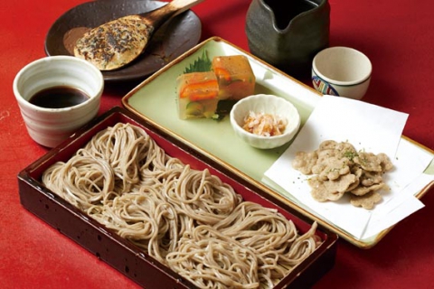 このお店は女性客が多く立ち寄り、中でも人気なのが、せいろにお通し3点、焼き味噌、酒(日本酒、生ビール、グラスワインのいずれか)が付く「そばセットA」(2,000円)。そばは福井県産の玄ソバを石臼で挽いた粉を使用している。福井県産は近年そば好きの間で注目を集めている。