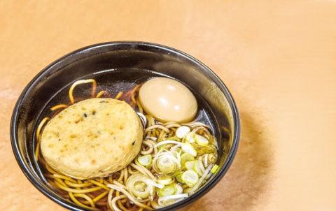 立川駅の名物といえば、同店の「おでんそば」(410円)。かけそばの上におでん種をさつま揚げ、がんもどき、玉子から選んで載せられる。そばは醤油の効いたつゆで典型的な昔ながらの駅そば。この組み合わせが絶妙なマッチングだ。